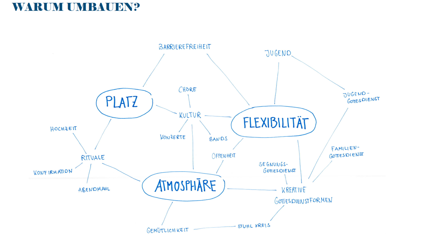 Bei einem Markt der Ideen waren alle Gemeindemitglieder eingeladen, sich mit Ideen, Vorschlägen und Kritik einzubringen. Entstanden ist ein bunter Nachmittag mit vielen Gesprächen, Anregungen, Skizzen, neuen Impulsen und geäußerten Meinungen. Neben der Umgestaltung zur flexibleren und barrierefreien Nutzung, war auch ein Wunsch, die zugehörigen Anbauten und Gemeinderäume in das Konzept integriert werden. Möglichst verschiedene Formen von Konzerten, Kulturveranstaltungen, Gottesdiensten und Formaten für Kinder und Jugendliche sollen in Zukunft möglich sein. Während des Beteiligungsprozesses wurden die verschiedenen Vorschläge gesammelt und ausgewertet.